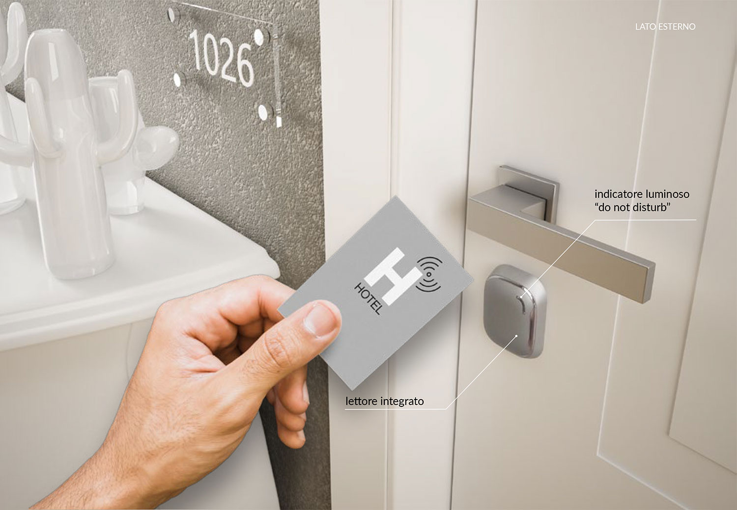 - Opera Bit integra lettore tessere e batterie senza cablaggi, con chiusura automatica antieffrazione, funzione “Do Not Disturb” e uscita antipanico dall’interno.